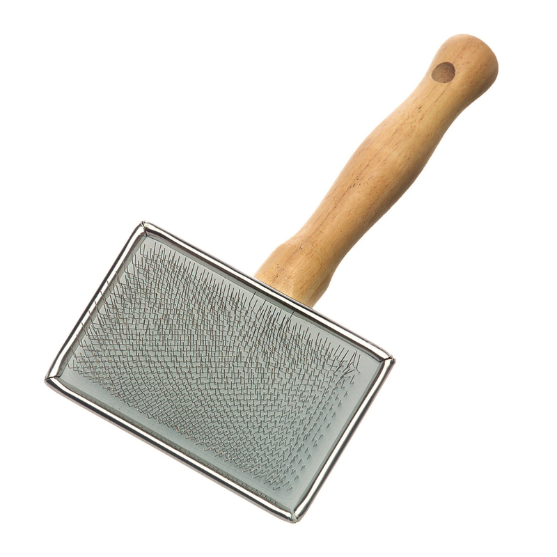 Die Artero Slickerbürste hat einen langen Griff für das bessere Handling beim Bürsten. Sie ist für Hunderasse mit mittellangem oder langem Fell zur Entwirrung des Hundehaars geeignet. Die Bürstenbreite beträgt nur 4,5 cm und erleichtert dadurch auch das Bürsten an den Beinen und unter den Achseln. Mit der Bürste können leichte Verfilzungen entfernt werden. Die Bürste hat kleine Stahlpins. Meine Welpen lassen sich mit dieser Bürste gerne bürsten. Größe 6 cm x 4,5 cm