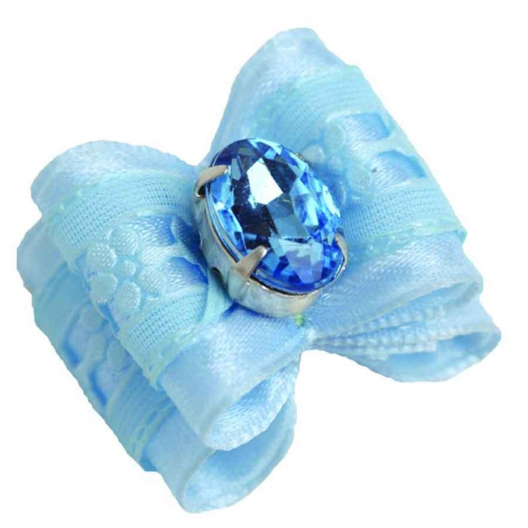 Dieses Schleifchen von Doggydolly Hundebekleidung ist himmelblau und hat einen großen, blauen Stein. Über dem blauen Stoff der Hundeschleife liegt ein ebenfalls blauer Tüll mit Blumenmuster. Die Haarschleife ist das perfekte Accessoire für die Hundefrisur.