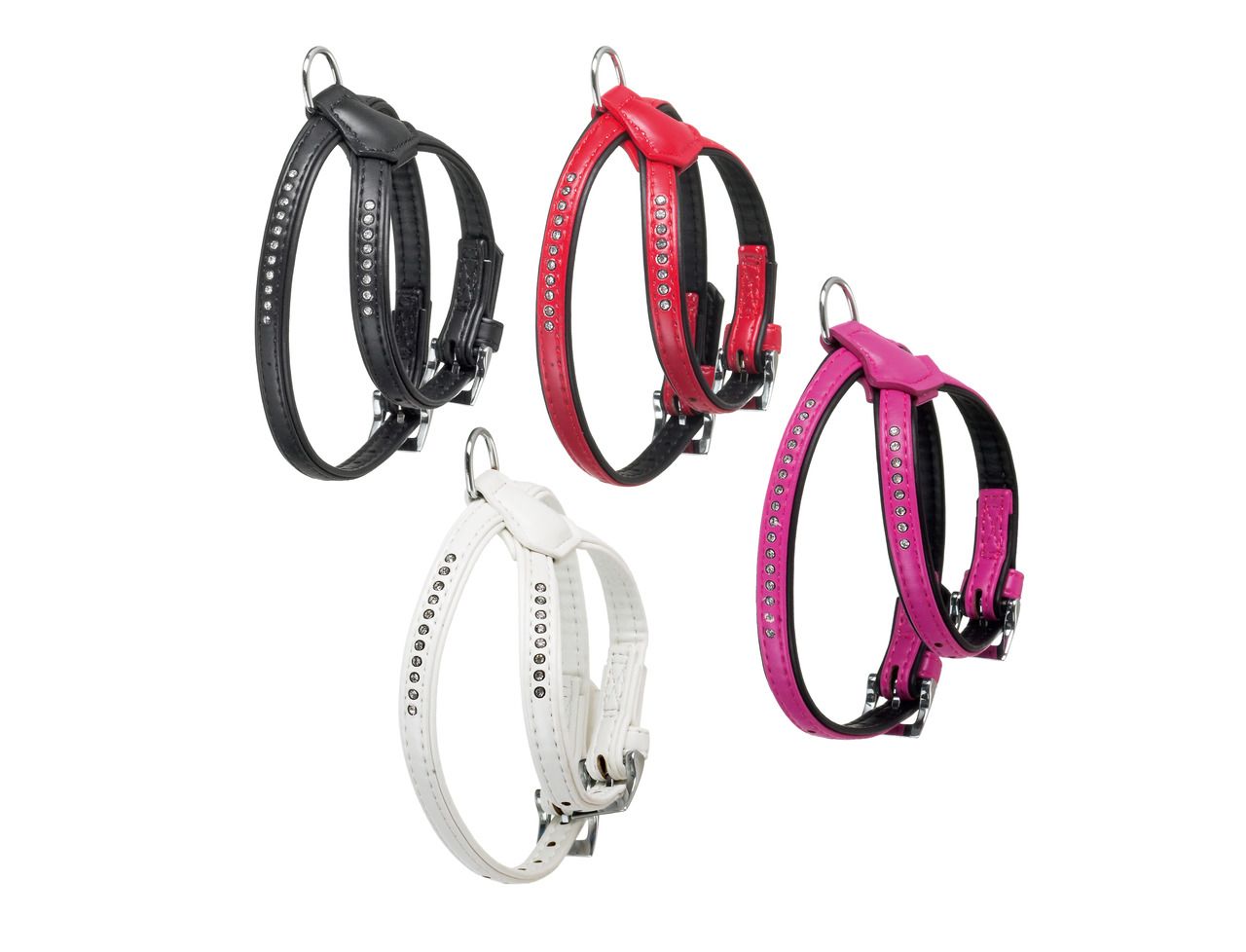 Das Karle Hundegeschirr Monte Carlo ist mit Strass besetzt und hat verchromte Beschläge. Das Hundegeschirr ist aus Kunstleder.