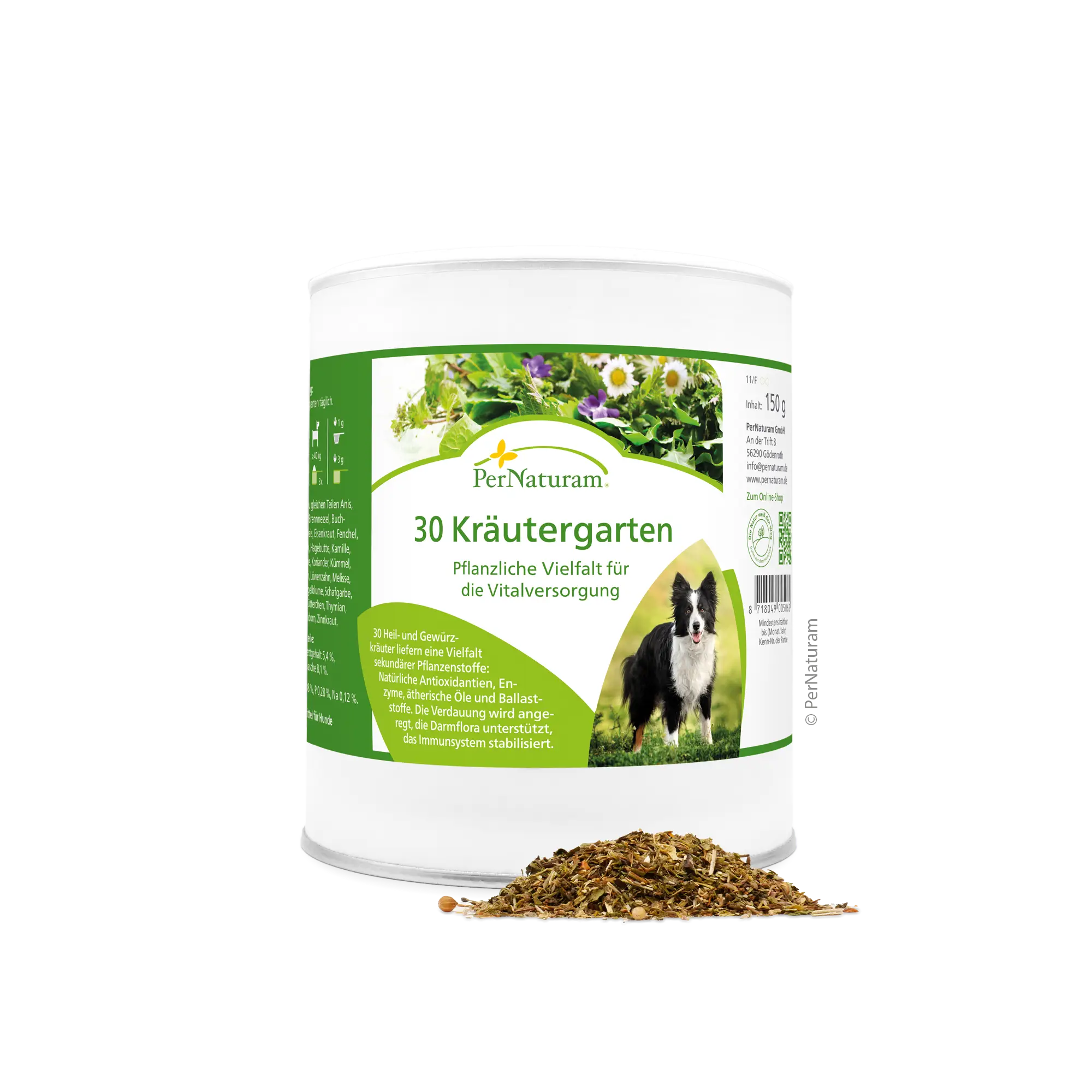 30 Heil- und Gewürzkräuter zu gleichen Teilen liefern eine Vielfalt sekundärer Pflanzenstoffe: Natürliche Antioxidantien, Enzyme, ätherische Öle und Ballaststoffe. Die Sekretion der Verdauungssäfte wird angeregt, die Darmflora unterstützt und das Immunsystem stabilisiert. Die Kräuter sind natürlich und haben eine hohe Qualität. Tipp: Kräuter einfach ins Nassfutter oder ins Barffutter mischen. Falls Trockenfutter gefüttert wird, kann man es gut in Kalbsleberwurst geben.
